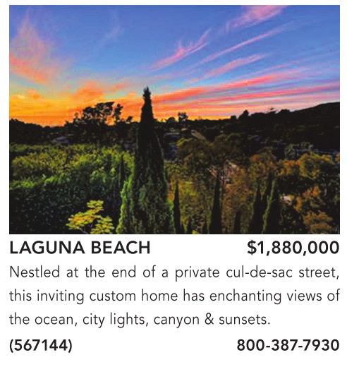 LAGUNA BEACH $1,880,000 Nestled at the end of a private cul-de-sac street, this inviting custom home has enchanting views of the ocean, city lights, canyon & sunsets. (567144) 800-387-7930