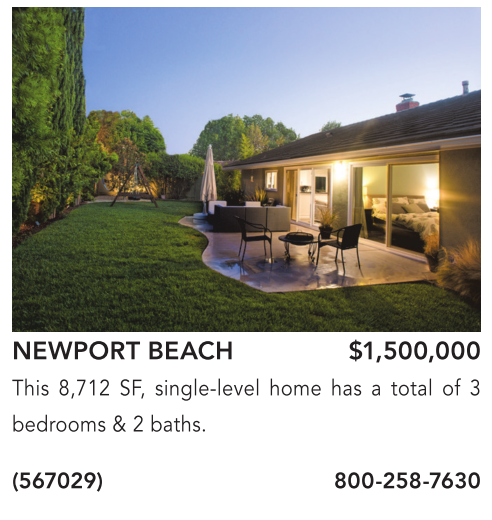 NEWPORT BEACH $1,500,000 This 8,712 SF, single-level home has a total of 3 bedrooms & 2 baths.