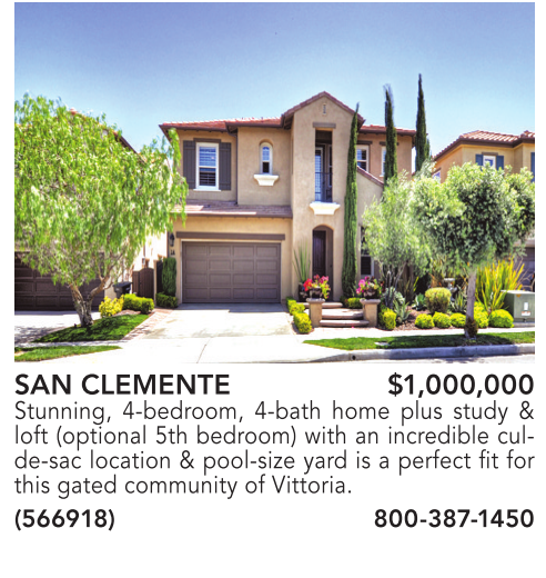 SAN CLEMENTE $1,000,000 Stunning, 4-bedroom, 4-bath home plus study & loft (optional 5th bedroom) with an incredible culde-sac location & pool-size yard is a perfect fit for this gated community of Vittoria. (566918) 800-387-1450