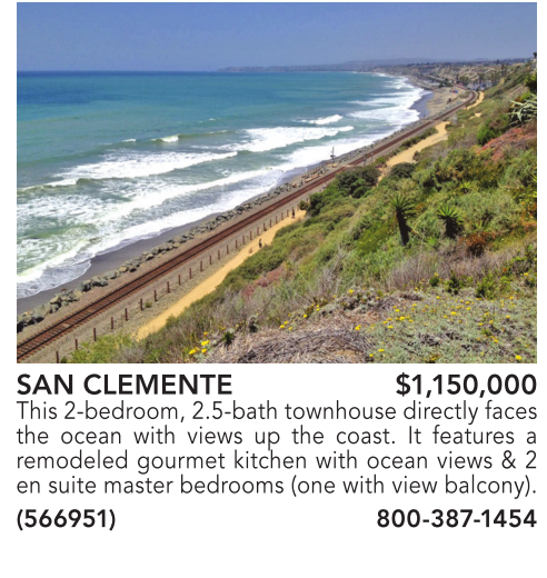SAN CLEMENTE $1,150,000 This 2-bedroom, 2.5-bath townhouse directly faces the ocean with views up the coast. It features a remodeled gourmet kitchen with ocean views & 2 en suite master bedrooms (one with view balcony). (566951) 800-387-1454