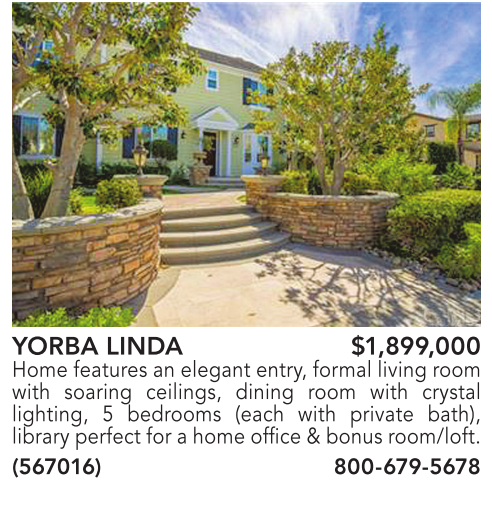 YORBA LINDA $1,899,000 Home features an elegant entry, formal living room with soaring ceilings, dining room with crystal lighting, 5 bedrooms (each with private bath), library perfect for ahome office &bonus room/loft. (567016) 800-679-5678