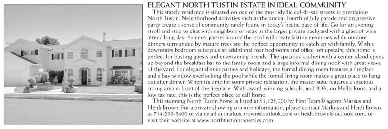 This stunning North Tustin home is listed at $1,125,000 by First Team® agents Markus and Heidi Brown. For a private showing or more information, please contact Markus and Heidi Brown at 714-299-3400 or via email at markus.brown@outlook.com or heidi.brown@outlook.com, or visit their website at www.northtustinproperties.com