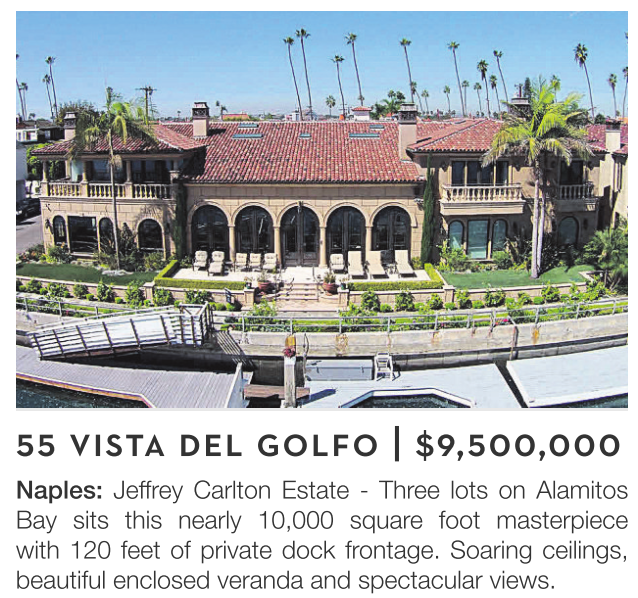 Naples: Jeffrey Carlton Estate - Three lots on Alamitos Bay sits this nearly 10,000 square foot masterpiece with 120 feet of private dock frontage. Soaring ceilings, beautiful enclosed veranda and spectacular views.