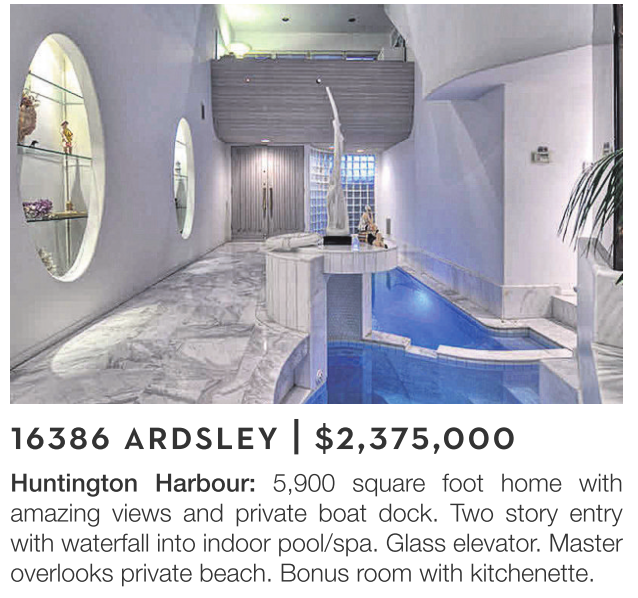 Huntington Harbour: 5,900 square foot home with amazing views and private boat dock. Two story entry with waterfall into indoor pool/spa. Glass elevator. Master overlooks private beach. Bonus room with kitchenette.