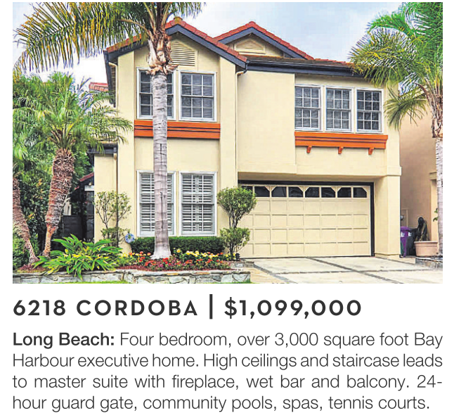 Long Beach: Four bedroom, over 3,000 square foot Bay Harbour executive home. High ceilings and staircase leads to master suite with fireplace, wet bar and balcony. 24- hour guard gate, community pools, spas, tennis courts.
