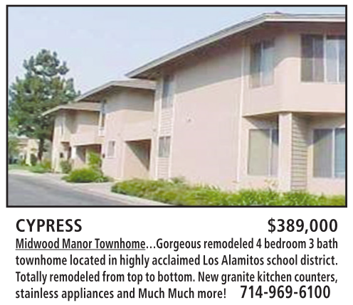 CYPRESS $389,000 Midwood Manor Townhome…Gorgeousremodeled 4bedroom 3bath townhomelocated in highly acclaimed LosAlamitosschooldistrict. Totallyremodeled from toptobottom. Newgranitekitchen counters, stainless appliances and Much Much more! 714-969-6100