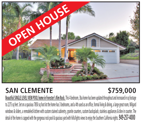 SAN CLEMENTE $759,000 Beautiful SINGLE LEVELVIEWPOOLhome in Forester’s RimRock. This 4bedroom, 3ba homehas been updatedthroughout and increasedinsqfootage to 2275 sq feet.Set on aspacious7850sqfootlot thehome has 3bedrooms,and a4th usedasanoffice, formal living &dining, alarge great room,Milgard windows &sliders, aremodeled kitchen with custom stained cabinetry, granite counters, custom backsplash, stainless appliances &dine incounter. The detail of thehome is capped with thegorgeous rock pool&spaciousyardwithhills/lightsviewstoenjoy theSouthernCalifornia nights. 949-257-4000