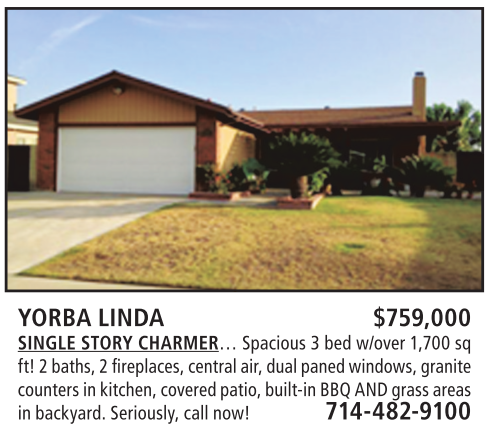 YORBA LINDA $759,000 SINGLE STORY CHARMER… Spacious 3bed w/over 1,700 sq