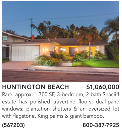 HUNTINGTON BEACH $1,060,000 Rare, approx. 1,700 SF, 3-bedroom, 2-bath Seacliff estate has polished travertine floors; dual-pane windows; plantation shutters & an oversized lot with flagstone, King palms & giant bamboo. (567203) 800-387-7925