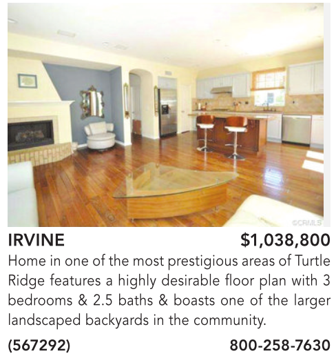 IRVINE $1,038,800 Home in one of the most prestigious areas of Turtle Ridge features a highly desirable floor plan with 3 bedrooms & 2.5 baths & boasts one of the larger landscaped backyards in the community. (567292) 800-258-7630
