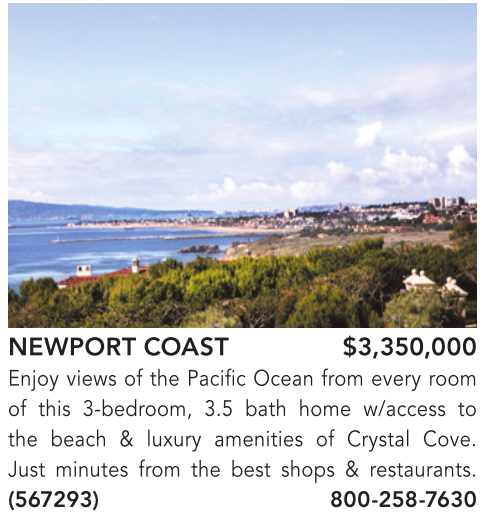 NEWPORT COAST $3,350,000 Enjoy views of the Pacific Ocean from every room of this 3-bedroom, 3.5 bath home w/access to the beach & luxury amenities of Crystal Cove. Just minutes from the best shops & restaurants. (567293) 800-258-7630