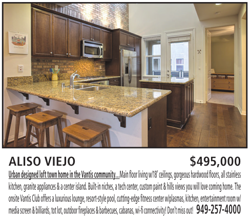 ALISO VIEJO $495,000 Urban designed loft townhome in theVantis community…Main floorliving w/18’ceilings,gorgeous hardwood floors, allstainless kitchen, granite appliances&acenter island. Built-inniches, atechcenter,custompaint &hillsviewsyou will love cominghome.The onsite Vantis Club offersaluxuriouslounge, resort-style pool, cutting-edge fitnesscenter w/plasmas,kitchen, entertainmentroomw/ mediascreen &billiards,tot lot,outdoor fireplaces&barbecues, cabanas,wi-fi connectivity! Don’tmissout! 949-257-4000