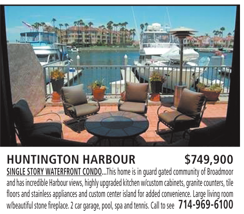 HUNTINGTON HARBOUR $749,900 SINGLE STORY WATERFRONT CONDO...This home is in guard gated community ofBroadmoor andhas incredible Harbour views, highly upgraded kitchen w/customcabinets, granite counters, tile floors and stainless appliances and custom center island for added convenience. Large living room w/beautifulstonefireplace.2car garage, pool, spaand tennis.Calltosee 714-969-6100