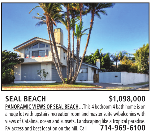 SEAL BEACH $1,098,000 PANORAMICVIEWS OF SEAL BEACH…This 4bedroom4bathhome is on ahugelot with upstairsrecreationroomand mastersuitew/balconieswith viewsofCatalina, ocean andsunsets.Landscapinglikeatropicalparadise. RV access andbestlocationonthe hill.Call 714-969-6100