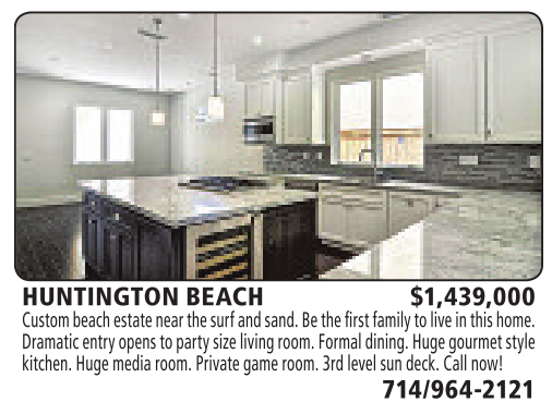 HUNTINGTON BEACH $1,439,000 Custom beach estate near thesurfand sand.Bethe first family to live in this home. Dramatic entryopens to partysize living room. Formal dining. Hugegourmet style kitchen. Hugemedia room. Privategameroom. 3rdlevel sundeck. Call now!