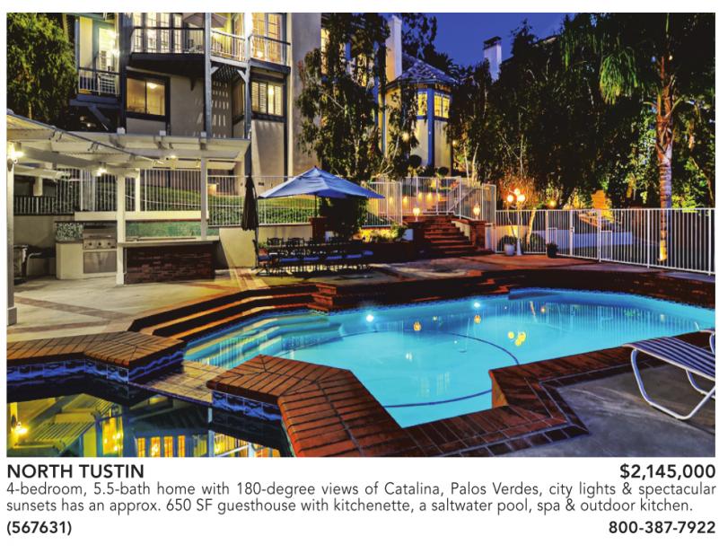 NORTH TUSTIN $2,145,000 4-bedroom, 5.5-bath home with 180-degree views of Catalina, Palos Verdes, city lights & spectacular sunsets has an approx. 650 SF guesthouse with kitchenette, a saltwater pool, spa & outdoor kitchen. (567631) 800-387-7922