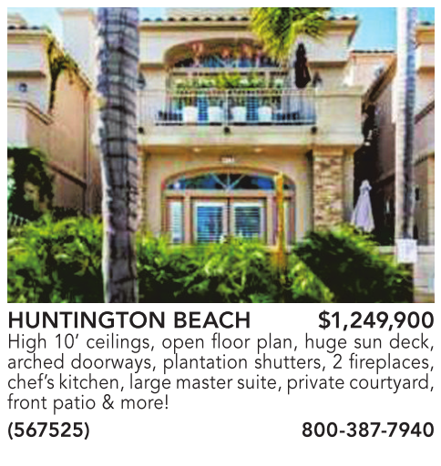 HUNTINGTON BEACH $1,249,900 High 10’ ceilings, open floor plan, huge sun deck, arched doorways, plantation shutters, 2 fireplaces, chef’s kitchen, large master suite, private courtyard, front patio & more! (567525) 800-387-7940