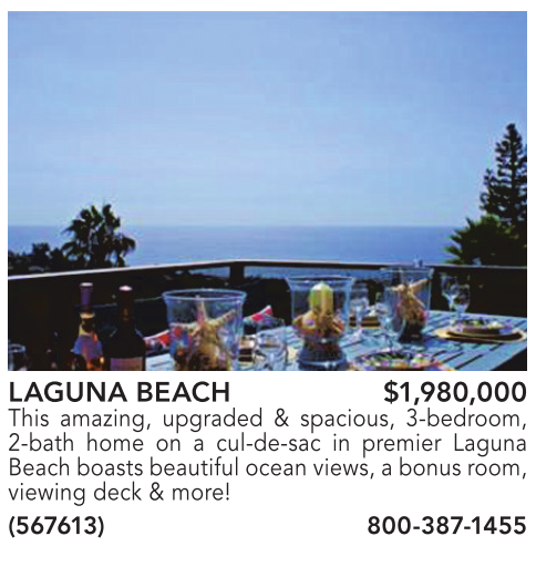 LAGUNA BEACH $1,980,000 This amazing, upgraded & spacious, 3-bedroom, 2-bath home on a cul-de-sac in premier Laguna Beach boasts beautiful ocean views, abonus room, viewing deck & more! (567613) 800-387-1455