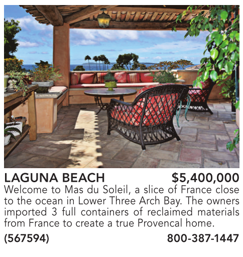 LAGUNA BEACH $5,400,000 Welcome to Mas du Soleil, a slice of France close to the ocean in Lower Three Arch Bay. The owners imported 3 full containers of reclaimed materials from France to create a true Provencal home. (567594) 800-387-1447
