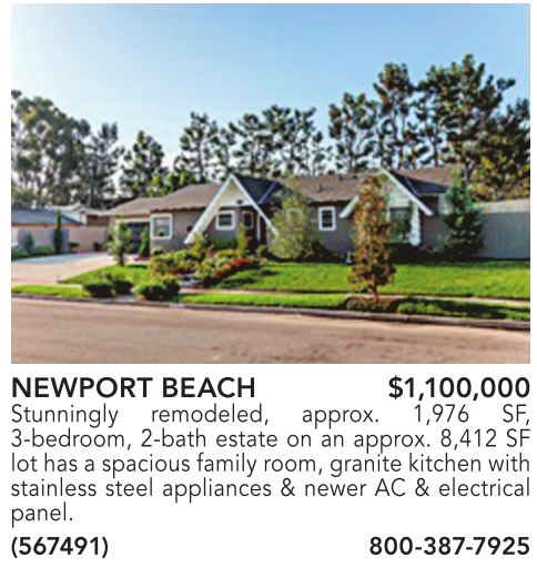 NEWPORT BEACH $1,100,000 Stunningly remodeled, approx. 1,976 SF, 3-bedroom, 2-bath estate on an approx. 8,412 SF lot has a spacious family room, granite kitchen with stainless steel appliances & newer AC & electrical panel. (567491) 800-387-7925