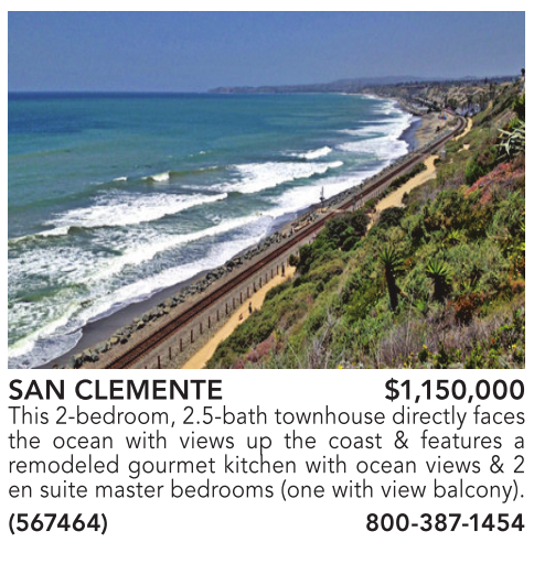 SAN CLEMENTE $1,150,000 This 2-bedroom, 2.5-bath townhouse directly faces the ocean with views up the coast & features a remodeled gourmet kitchen with ocean views & 2 en suite master bedrooms (one with view balcony). (567464) 800-387-1454