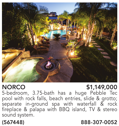 NORCO $1,149,000 5-bedroom, 3.75-bath has a huge Pebble Tec pool with rock falls, beach entries, slide & grotto; separate in-ground spa with waterfall & rock fireplace & palapa with BBQ island, TV & stereo sound system. (567448) 888-307-0052