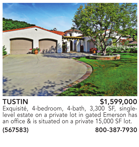 TUSTIN $1,599,000 Exquisité, 4-bedroom, 4-bath, 3,300 SF, singlelevel estate on a private lot in gated Emerson has an office & is situated on a private 15,000 SF lot.