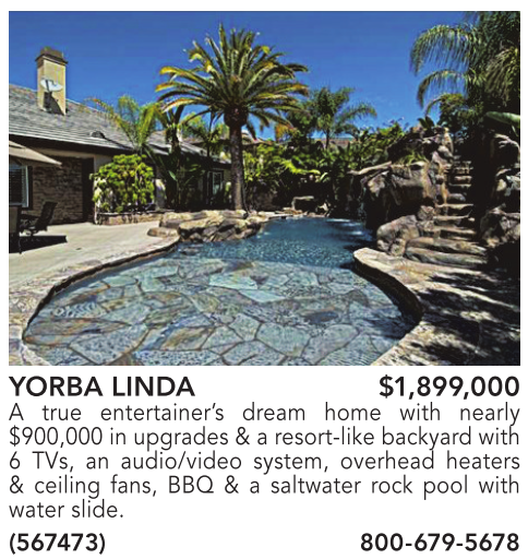 YORBA LINDA $1,899,000 A true entertainer’s dream home with nearly $900,000 in upgrades & a resort-like backyard with 6 TVs, an audio/video system, overhead heaters & ceiling fans, BBQ & a saltwater rock pool with water slide. (567473) 800-679-5678
