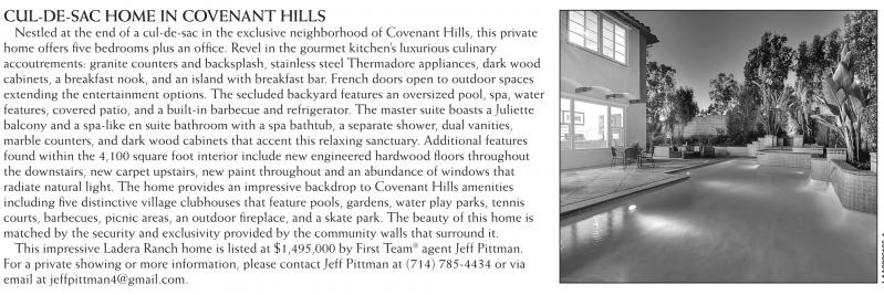 Nestled at the end of a cul-de-sac in the exclusive neighborhood of Covenant Hills, this private home offers five bedrooms plus an office. Revel in the gourmet kitchen’s luxurious culinary accoutrements: granite counters and backsplash, stainless steel Thermadore appliances, dark wood cabinets, a breakfast nook, and an island with breakfast bar. French doors open to outdoor spaces extending the entertainment options. The secluded backyard features an oversized pool, spa, water features, covered patio, and a built-in barbecue and refrigerator. The master suite boasts a Juliette balcony and a spa-like en suite bathroom with a spa bathtub, a separate shower, dual vanities, marble counters, and dark wood cabinets that accent this relaxing sanctuary. Additional features found within the 4,100 square foot interior include new engineered hardwood floors throughout the downstairs, new carpet upstairs, new paint throughout and an abundance of windows that radiate natural light. The home provides an impressive backdrop to Covenant Hills amenities including five distinctive village clubhouses that feature pools, gardens, water play parks, tennis courts, barbecues, picnic areas, an outdoor fireplace, and a skate park. The beauty of this home is matched by the security and exclusivity provided by the community walls that surround it.