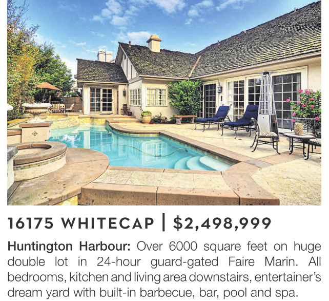 Huntington Harbour: Over 6000 square feet on huge double lot in 24-hour guard-gated Faire Marin. All bedrooms, kitchen and living area downstairs, entertainer’s dream yard with built-in barbecue, bar, pool and spa.