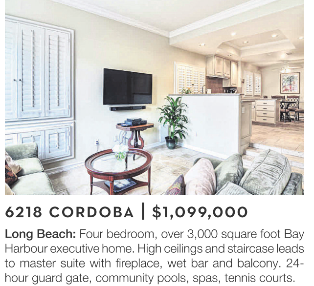 Long Beach: Four bedroom, over 3,000 square foot Bay Harbour executive home. High ceilings and staircase leads to master suite with fireplace, wet bar and balcony. 24- hour guard gate, community pools, spas, tennis courts.