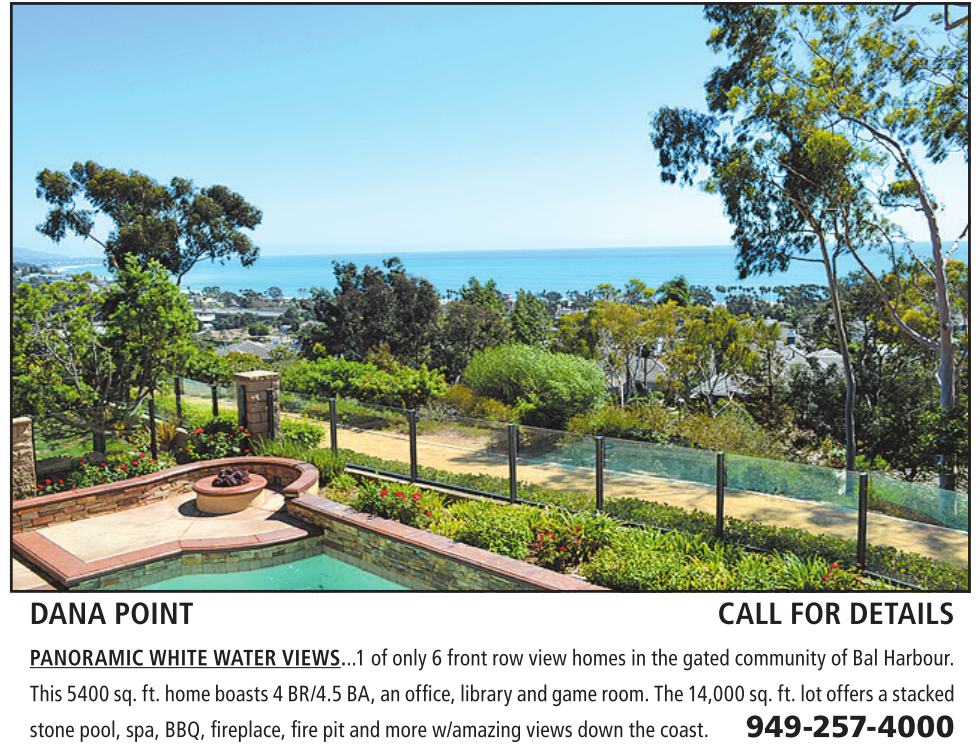DANA POINT CALL FOR DETAILS PANORAMIC WHITE WATER VIEWS...1ofonly6frontrow view homesinthe gatedcommunity of BalHarbour. This 5400 sq. ft.home boasts 4BR/4.5BA, an office, libraryand game room. The14,000 sq. ft.lot offers astacked stone pool, spa, BBQ, fireplace,fire pit andmore w/amazingviews down thecoast. 949-257-4000