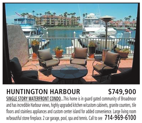 HUNTINGTON HARBOUR $749,900 SINGLE STORY WATERFRONT CONDO...This home is in guard gated community ofBroadmoor andhas incredible Harbour views, highly upgraded kitchen w/customcabinets, granite counters, tile floors and stainless appliances and custom center island for added convenience. Large living room w/beautifulstonefireplace.2car garage, pool, spaand tennis.Calltosee 714-969-6100