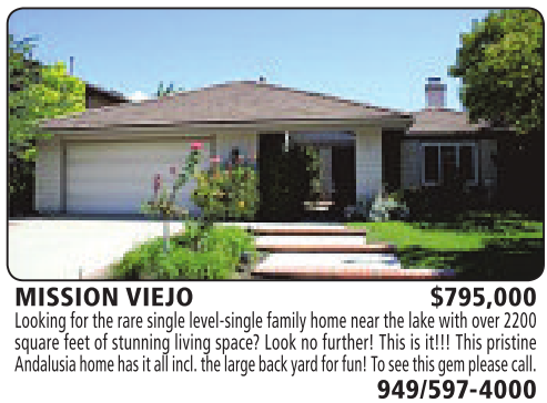 MISSION VIEJO $795,000 Looking for theraresingle level-single family home near thelakewithover2200 square feet ofstunning living space? Look nofurther! This is it!!! This pristine Andalusiahome hasitall incl. thelarge back yard for fun! To seethis gemplease call. 949/597-4000 See also