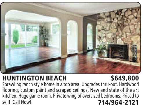 HUNTINGTON BEACH $649,800 Sprawlingranch stylehome in atop area.Upgrades thru-out.Hardwood flooring, custom paint and scraped ceilings. New and state of the art kitchen. Huge game room.Privatewingofoversizedbedrooms.Pricedto sell! CallNow! 714/964-2121