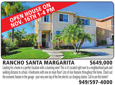 RANCHO SANTA MARGARITA $649,000 Looking for ahome in aperfect location with astunning view? This is it! Located right next toaneighborhood park and walking distance to school. 4bedrooms with one on main floor! Lots of nice features throughout the home. Check out the economic feature in thegarage-your very owntop of thelineelectriccar charging station. Call to seethis home!! 949/597-4000 See also