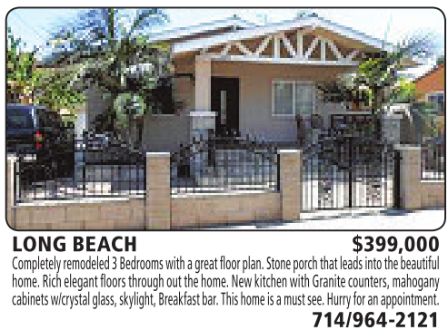 LONG BEACH $399,000 Completelyremodeled3Bedrooms with agreat floorplan. Stone porch that leadsintothe beautiful home.Richelegantfloors through out thehome.New kitchen with Granite counters,mahogany cabinets w/crystalglass,skylight, Breakfastbar.This home is amust see. Hurry for an appointment. 714/964-2121 See also