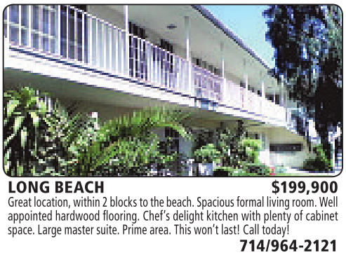 LONG BEACH $199,900 Great location,within 2blockstothe beach. Spacious formal living room. Well appointed hardwood flooring. Chef’s delight kitchen with plenty ofcabinet space.Large mastersuite. Primearea. This won’tlast! Call today! 714/964-2121 See also