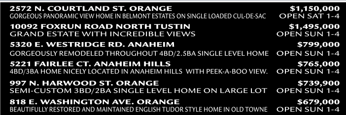 2572 N. COURTLAND ST. ORANGE $1,150,000 GORGEOUS PANORAMIC VIEW HOME IN BELMONT ESTATES ON SINGLELOADED CUL-DE-SAC OPEN SAT1-4 10092 FOXRUN ROAD NORTH TUSTIN $1,495,000 GRANDESTATEWITH INCREDIBLE VIEWS OPENSUN 1-4 5320 E. WESTRIDGE RD. ANAHEIM $799,000 GORGEOUSLY REMODELED THROUGHOUT 4BD/2.5BA SINGLELEVEL HOME OPEN SUN1-4 5221 FAIRLEE CT. ANAHEIM HILLS $765,000 4BD/3BA HOME NICELY LOCATED INANAHEIM HILLS WITH PEEK-A-BOO VIEW. OPEN SUN1-4 997 N.HARWOOD ST. ORANGE $739,900 SEMI-CUSTOM 3BD/2BA SINGLELEVEL HOMEONLARGELOT OPEN SUN1-4 818 E.WASHINGTON AVE. ORANGE $679,000 BEAUTIFULLY RESTORED AND MAINTAINED ENGLISH TUDORSTYLE HOME IN OLD TOWNE OPEN SUN1-4
