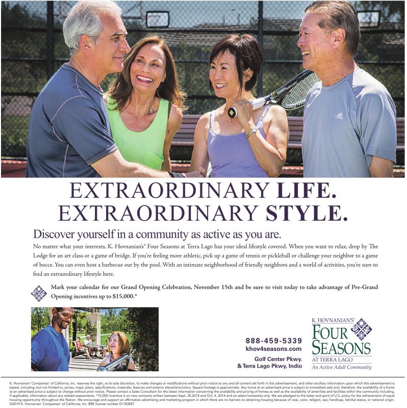 K. Hovnanian® Companies® of California, Inc. reserves the right, at its sole discretion, to make changes or modifications without prior notice to any and all content set forth in this advertisement, and other ancillary information upon which this advertisement is based, including, but not limited to, prices, maps, plans, specifications, materials, features and exterior elevations/colors. Square footage is approximate. Any home at an advertised price is subject to immediate sale and, therefore, the availability of ahome at an advertised price is subject to change without prior notice. Please contact aSales Consultant for the latest information concerning the availability and pricing of homes as well as the availability of amenities and facilities within the community including, if applicable, information about any related assessments. *15,000 incentive is on new contracts written between Sept. 20,2014 and Oct. 4,2014 and on select homesites only. Weare pledged to the letter and spirit of U.S. policy for the achievement of equal housing opportunity throughout the Nation. We encourage and support an affirmative advertising and marketing program in which there are no barriers to obtaining housing because of race, color, religion, sex, handicap, familial status, or national origin. ©2014 K. Hovnanian® Companies® of California, Inc. BRE license number 01183847