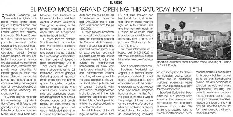 Brookfield Residential announces the model unveiling of El Paseo in Foothill Ranch