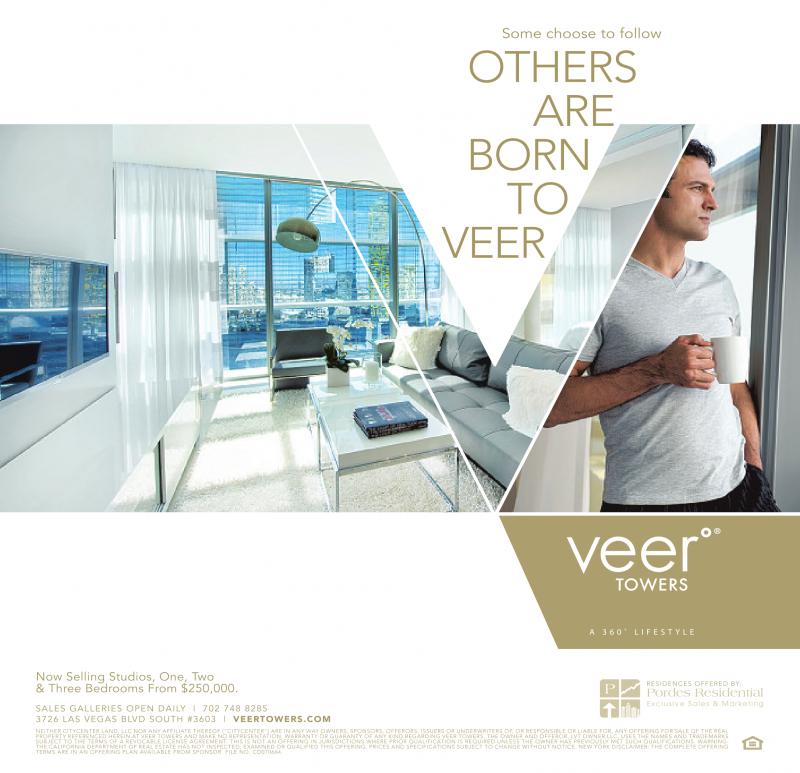 Some choose to follow OTHERS ARE BORN TO VEER A 3 6 0 L I F E S T Y L ENow Selling Studios, One, Two & Three Bedrooms From $250,000. RESIDENCES OFFERED BY: SALES GALLERIES OPEN DAILY | 702 748 8285 3726 LAS VEGAS BLVD SOUTH #3603 | VEERTOWERS.COM NEITHER CITYCENTER LAND, LLC NOR ANY AFFILIATE THEREOF(“CITYCENTER”) ARE IN ANY WAY OWNERS, SPONSORS, OFFERORS, ISSUERS OR UNDERWRITERS OF,ORRESPONSIBLE OR LIABLE FOR, ANY OFFERING FOR SALE OF THE REAL PROPERTY REFERENCED HEREIN AT VEER TOWERS AND MAKE NO REPRESENTATION, WARRANTY OR GUARANTY OF ANY KIND REGARDING VEER TOWERS. THE OWNER AND OFFEROR, LVT OWNERLLC, USES THE NAMES AND TRADEMARKS SUBJECT TO THE TERMS OF A REVOCABLE LICENSE AGREEMENT. THIS IS NOT AN OFFERING IN JURISDICTIONS WHERE PRIOR QUALIFICATION IS REQUIRED UNLESS THE OWNER HAS PREVIOUSLY MET SUCH QUALIFICATIONS. WARNING: THE CALIFORNIA DEPARTMENT OF REAL ESTATE HAS NOT INSPECTED, EXAMINED OR QUALIFIEDTHIS OFFERING. PRICES AND SPECIFICATIONS SUBJECT TO CHANGE WITHOUT NOTICE. NEW YORK DISCLAIMER: THE COMPLETE OFFERING TERMS ARE IN AN OFFERING PLAN AVAILABLE FROM SPONSOR. FILE NO. CD070664.