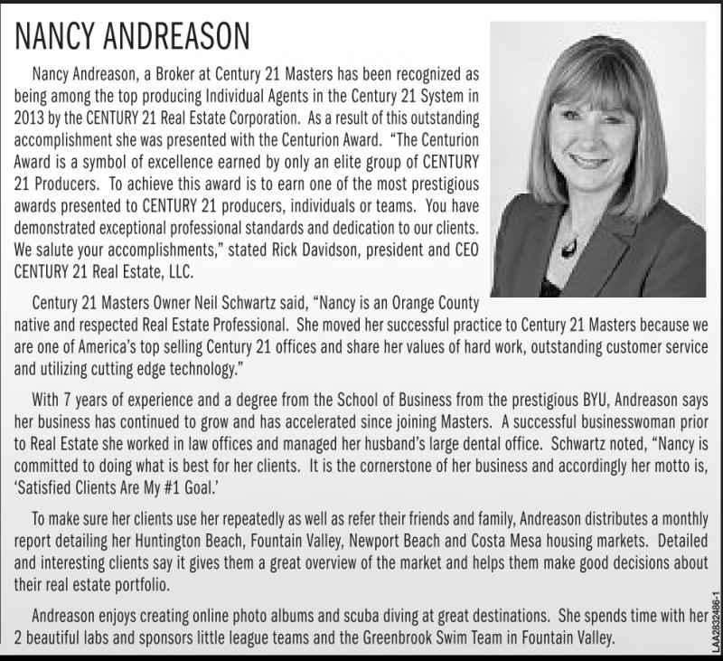 NANCY ANDREASON Nancy Andreason, a Broker at Century 21 Masters has been recognized as being among the top producing Individual Agents in the Century 21 System in 2013 by theCENTURY 21 Real Estate Corporation. As aresultofthisoutstanding accomplishment she was presented with the Centurion Award. “The Centurion Award is a symbol of excellence earned by only an elite group of CENTURY 21 Producers. To achieve this award is to earn one of the most prestigious awards presented to CENTURY 21 producers, individuals or teams. You have demonstratedexceptionalprofessional standards anddedication to ourclients. We salute your accomplishments,” stated Rick Davidson, president and CEO CENTURY 21 Real Estate, LLC. Century 21 Masters Owner Neil Schwartz said, “Nancy is an Orange County native andrespected Real Estate Professional. Shemovedher successfulpracticetoCentury 21 Mastersbecausewe are one of America’s top selling Century 21 offices and share her values of hard work, outstanding customer service and utilizing cutting edge technology.” With 7 years of experience and a degree from the School of Business from the prestigious BYU, Andreason says her business has continued to grow and has accelerated since joining Masters. A successful businesswoman prior to Real Estate she worked in law offices and managed her husband’s large dental office. Schwartz noted, “Nancy is committed to doing what is best for her clients. It is the cornerstone of her business and accordingly her motto is, ‘Satisfied Clients Are My #1 Goal.’ To make sure herclientsuse herrepeatedly as well as refertheir friends andfamily,Andreasondistributesamonthly report detailing her Huntington Beach, Fountain Valley, Newport Beach and Costa Mesa housing markets. Detailed and interesting clients say it gives them a great overview of the market and helps them make good decisions about their real estate portfolio. Andreason enjoys creating online photo albums and scuba diving at great destinations. She spends time with her 2 beautiful labs and sponsors little league teams and the Greenbrook Swim Team in Fountain Valley.