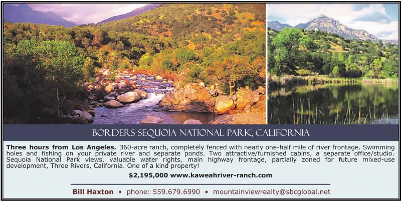 BORDERS SEQUOIA NATIONAL PARK, CALIFORNIA Three hours from Los Angeles. 360-acre ranch, completely fenced with nearly one-half mile of river frontage. Swimming holes and fishing on your private river and separate ponds. Two attractive/furnished cabins, a separate office/studio. Sequoia National Park views, valuable water rights, main highway frontage, partially zoned for future mixed-use development, Three Rivers, California. One of a kind property! $2,195,000 www.kaweahriver-ranch.com Bill Haxton • phone: 559.679.6990 • mountainviewrealty@sbcglobal.net