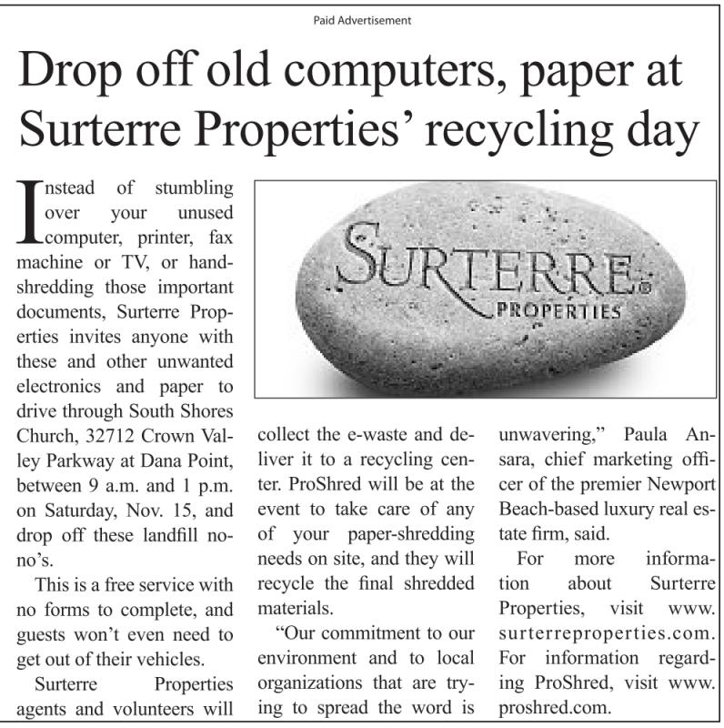 Instead of stumbling over your unused computer, printer, fax machine or TV, or handshredding those important documents, Surterre Properties invites anyone with these and other unwanted electronics and paper to drive through South Shores Church, 32712 Crown Valley Parkway at Dana Point, between 9 a.m. and 1 p.m. on Saturday, Nov. 15, and drop off these landfill nono’s. This is a free service with no forms to complete, and guests won’t even need to get out of their vehicles. Surterre Properties agents and volunteers will Paid Advertisement Drop off old computers, paper at Surterre Properties’ recycling day collect the e-waste and deliver it to a recycling center. ProShred will be at the event to take care of any of your paper-shredding needs on site, and they will recycle the final shredded materials. “Our commitment to our environment and to local organizations that are trying to spread the word is unwavering,” Paula Ansara, chief marketing officer of the premier Newport Beach-based luxury real estate firm, said. For more information about Surterre Properties, visit www. surterreproperties.com. For information regarding ProShred, visit www. proshred.com.