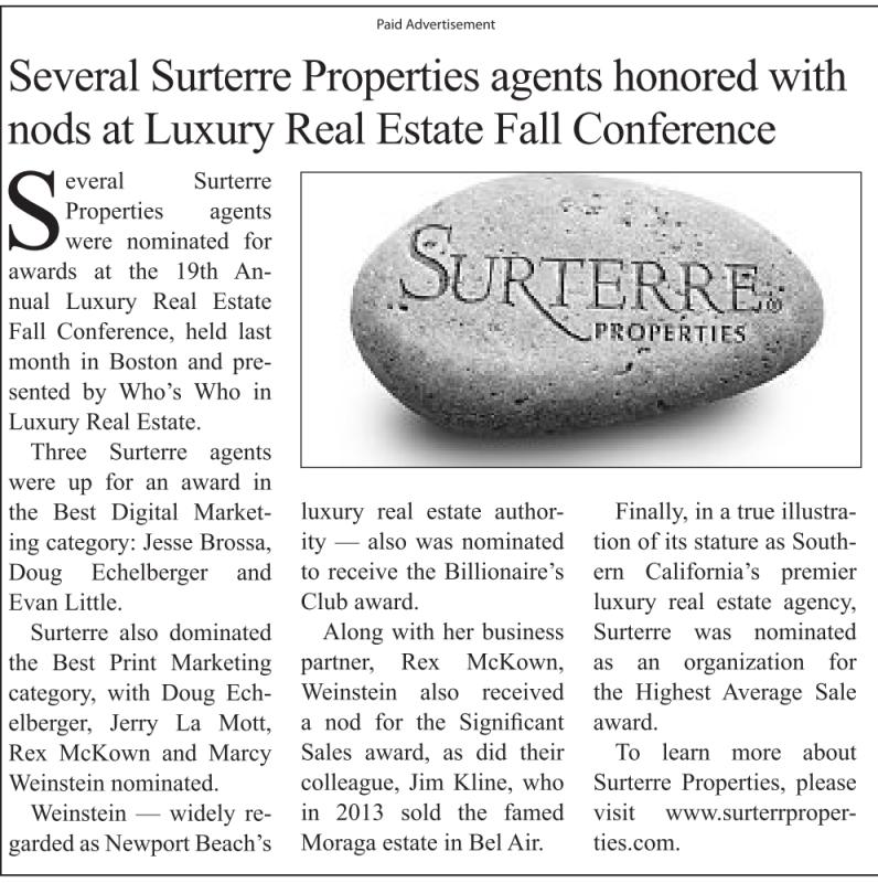 Several Surterre Properties agents were nominated for awards at the 19th Annual Luxury Real Estate Fall Conference, held last month in Boston and presented by Who’s Who in Luxury Real Estate. Three Surterre agents were up for an award in the Best Digital Marketing category: Jesse Brossa, Doug Echelberger and Evan Little. Surterre also dominated the Best Print Marketing category, with Doug Echelberger, Jerry La Mott, Rex McKown and Marcy Weinstein nominated. Weinstein — widely regarded as Newport Beach’s Paid Advertisement Several Surterre Properties agents honored with nods at Luxury Real Estate Fall Conference luxury real estate authority — also was nominated to receive the Billionaire’s Club award. Along with her business partner, Rex McKown, Weinstein also received a nod for the Significant Sales award, as did their colleague, Jim Kline, who in 2013 sold the famed Moraga estate in Bel Air. Finally, in a true illustration of its stature as Southern California’s premier luxury real estate agency, Surterre was nominated as an organization for the Highest Average Sale award. To learn more about Surterre Properties, please visit www.surterrproperties.com.