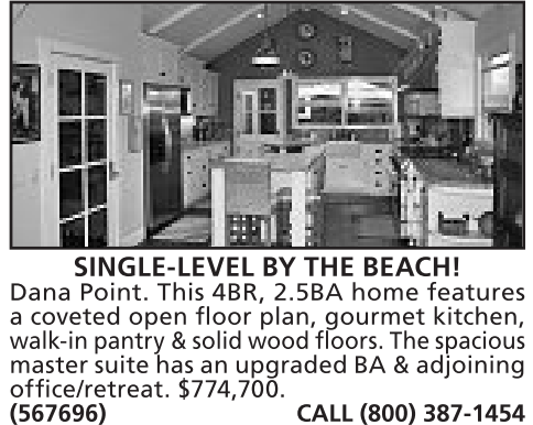 SINGLE-LEVEL BY THE BEACH! Dana Point. This 4BR, 2.5BA home features a coveted open floor plan, gourmet kitchen, walk-inpantry &solid wood floors. Thespacious master suite has an upgraded BA & adjoining office/retreat. $774,700. (567696) CALL (800) 387-1454