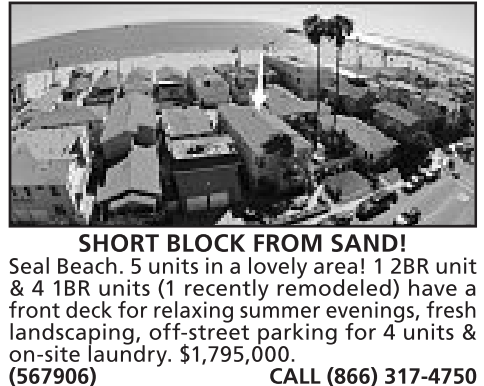 SHORT BLOCK FROM SAND! Seal Beach. 5units in alovelyarea!12BR unit & 4 1BR units (1 recently remodeled) have afrontdeckfor relaxing summer evenings, fresh landscaping, off-street parking for 4 units &on-site laundry. $1,795,000. (567906) CALL (866) 317-4750