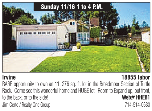 Irvine Sunday 11/16 1to4P.M. 18855 tabor Jim Certo /Realty One Group 714-514-0630 RARE opportunity to own an 11, 276 sq. ft. lot in the Broadmoor Section of Turtle Rock. Come see this wonderful home and HUGE lot. Room to Expand up, out front, to the back, or to the side! Web# HHEB1