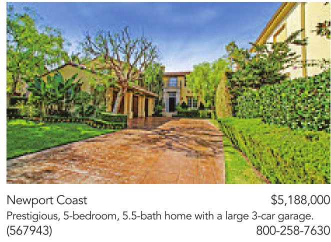 Newport Coast $5,188,000 Prestigious, 5-bedroom, 5.5-bath home with alarge 3-car garage. (567943) 800-258-7630